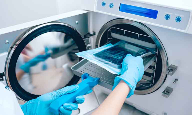 患者様に使用するあらゆる器具は、治療が終わるたびに丁寧に洗浄した後、滅菌パックに入れて、高圧蒸気滅菌器滅菌をかけ、無菌状態にします。滅菌パックの内部は、高圧蒸気滅菌器から出した後も滅菌状態が保たれ、診療開始時に開封するので、いつも清潔な状態となっています。